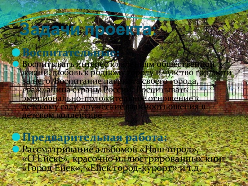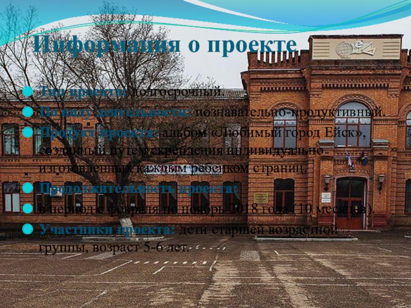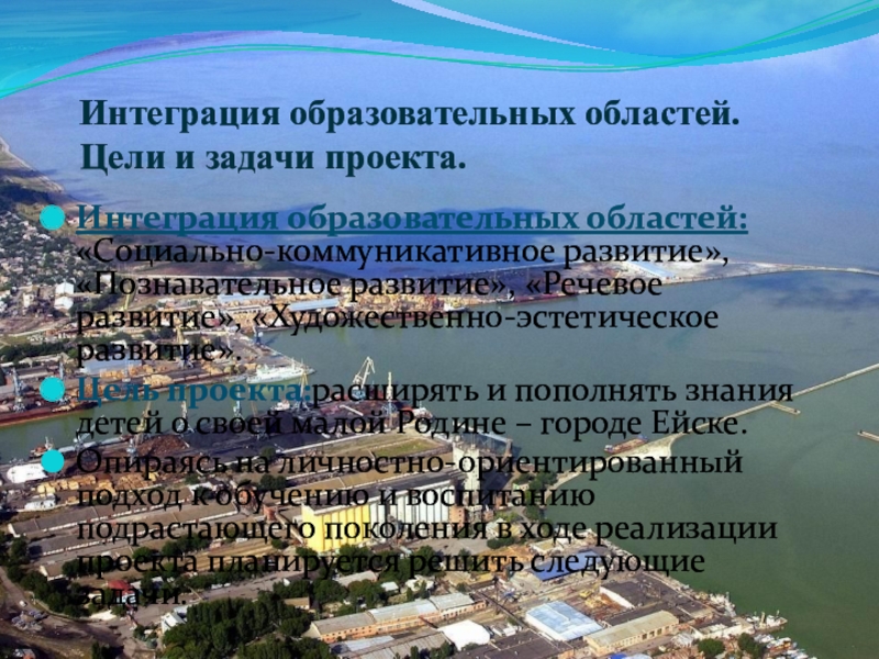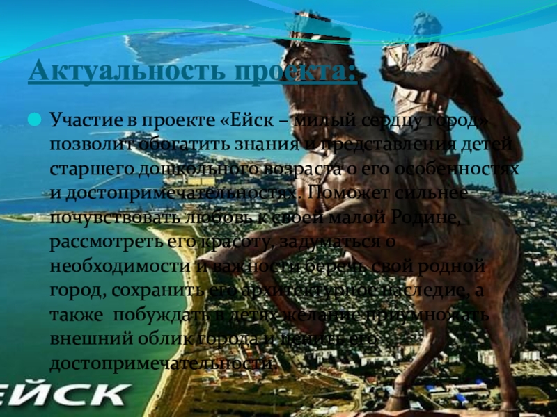 Цель проекта:расширять и пополнять знания детей о своей малой Родине – городе Ейске.