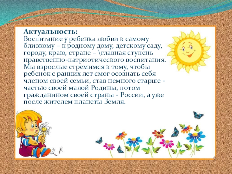 Мы взрослые стремимся к тому, чтобы ребенок с ранних лет смог осознать себя членом своей семьи, став немного старше - частью своей малой Родины, потом гражданином своей страны - России, а уже после жителем планеты Земля.