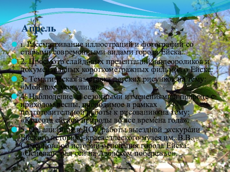 4. Наблюдение за сезонными изменениями в природе с приходом весны, проводимое в рамках подготовительной работы к рисованию на тему: «Красота ейской природы во все времена года».