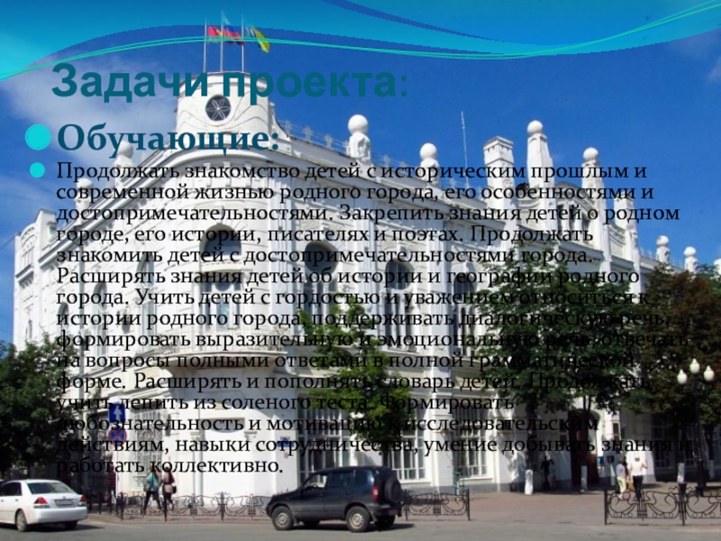 города, его особенностями и достопримечательностями. Закрепить знания детей о родном городе, его истории, писателях и поэтах. Продолжать знакомить детей с достопримечательностями города. Расширять знания детей об истории и географии родного города. Учить детей с гордостью и уважением относиться к истории родного города, поддерживать диалогическую речь, формировать выразительную и эмоциональную речь, отвечать на вопросы полными ответами в полной грамматической форме. Расширять и пополнять словарь детей. Продолжать учить лепить из соленого теста. Формировать любознательность и мотивацию к исследовательским действиям, навыки сотрудничества, умение добывать знания и работать коллективно.