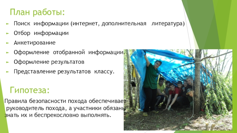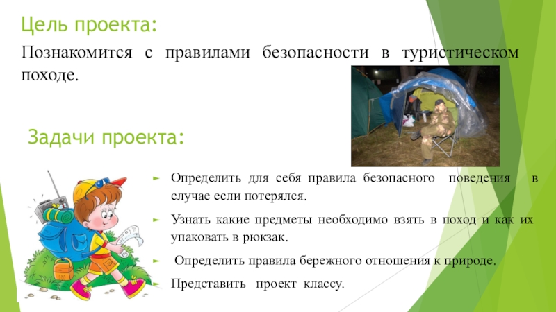 Познакомится с правилами безопасности в туристическом походе.