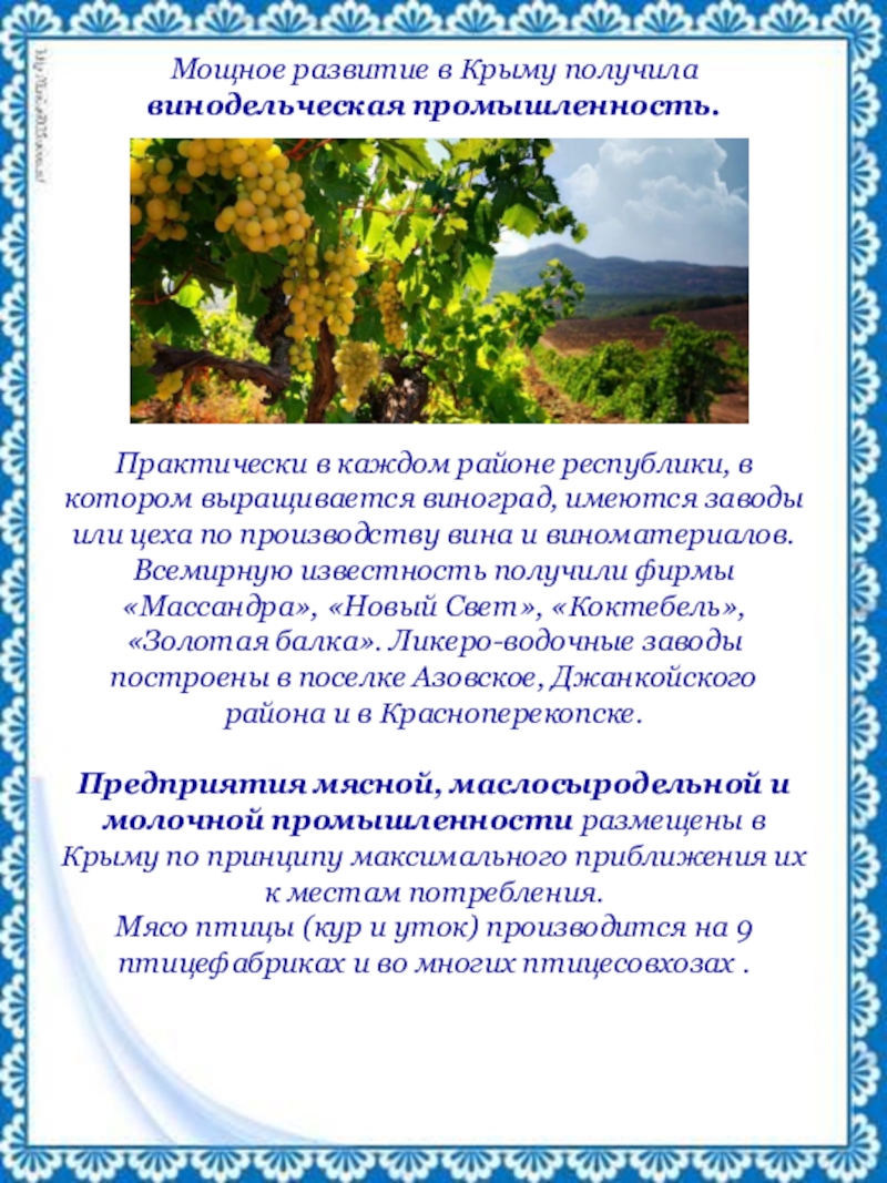Слайд 7Мощное развитие в Крыму получила винодельческая промышленность.