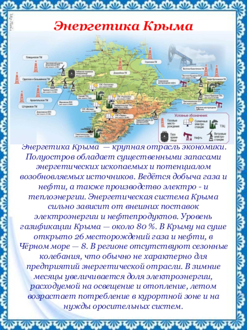 запасами энергетических ископаемых и потенциалом возобновляемых источников. Ведётся добыча газа и нефти, а также производство электро - и теплоэнергии. Энергетическая система Крыма сильно зависит от внешних поставок электроэнергии и нефтепродуктов. Уровень газификации Крыма — около 80 %. В Крыму на суше открыто 26 месторождений газа и нефти, в Чёрном море — 8. В регионе отсутствуют сезонные колебания, что обычно не характерно для предприятий энергетической отрасли. В зимние месяцы увеличивается доля электроэнергии, расходуемой на освещение и отопление, летом возрастает потребление в курортной зоне и на нужды оросительных систем.