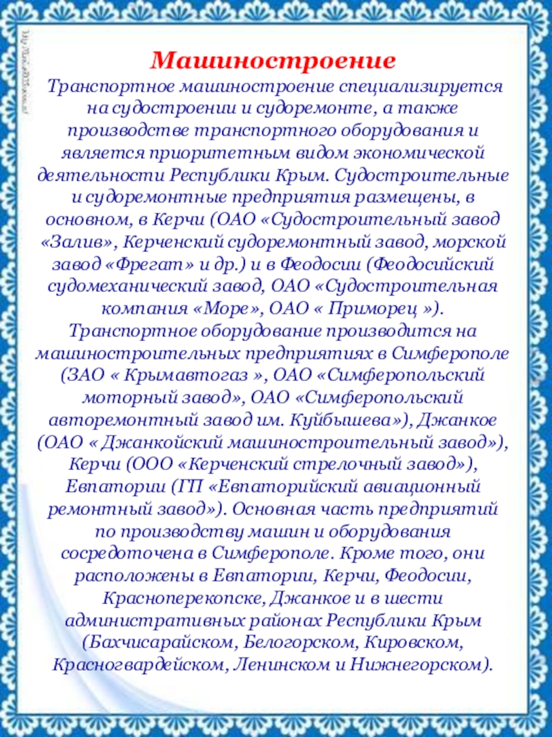 транспортного оборудования и является приоритетным видом экономической деятельности Республики Крым. Судостроительные и судоремонтные предприятия размещены, в основном, в Керчи (ОАО «Судостроительный завод «Залив», Керченский судоремонтный завод, морской завод «Фрегат» и др.) и в Феодосии (Феодосийский судомеханический завод, ОАО «Судостроительная компания «Море», ОАО « Приморец »). Транспортное оборудование производится на машиностроительных предприятиях в Симферополе (ЗАО « Крымавтогаз », ОАО «Симферопольский моторный завод», ОАО «Симферопольский авторемонтный завод им. Куйбышева»), Джанкое (ОАО « Джанкойский машиностроительный завод»), Керчи (ООО «Керченский стрелочный завод»), Евпатории (ГП «Евпаторийский авиационный ремонтный завод»). Основная часть предприятий по производству машин и оборудования сосредоточена в Симферополе. Кроме того, они расположены в Евпатории, Керчи, Феодосии, Красноперекопске, Джанкое и в шести административных районах Республики Крым (Бахчисарайском, Белогорском, Кировском, Красногвардейском, Ленинском и Нижнегорском).