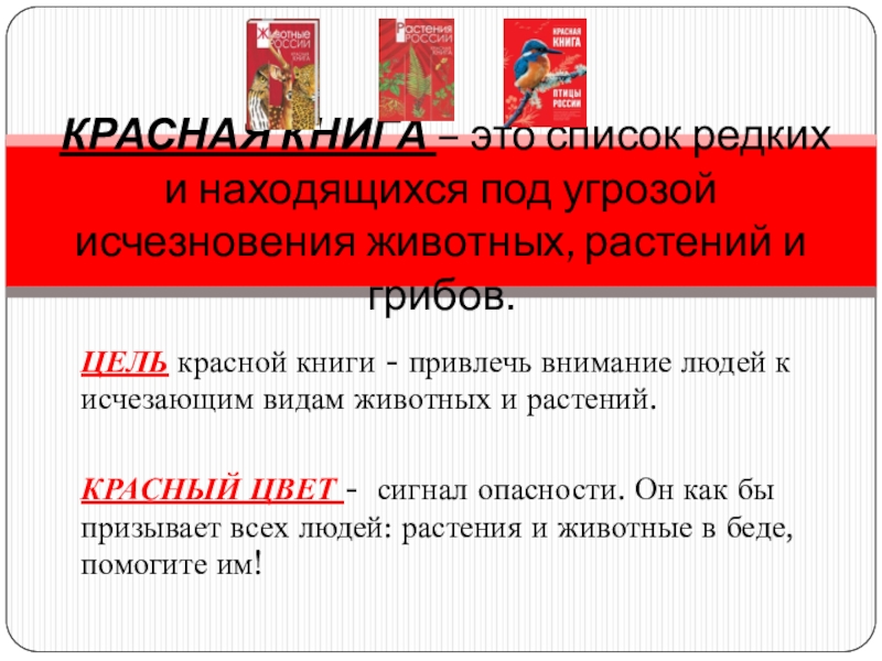 КРАСНАЯ КНИГА – это список редких и находящихся под угрозой исчезновения животных, растений и грибов.