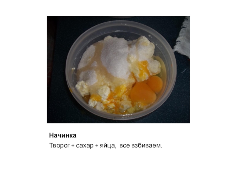 НачинкаТворог + сахар + яйца, все взбиваем.