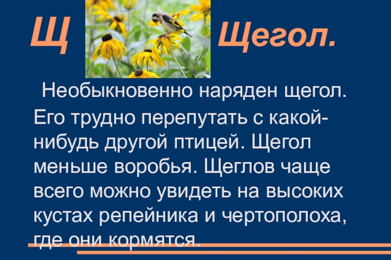 Его трудно перепутать с какой-нибудь другой птицей. Щегол меньше воробья. Щеглов чаще всего можно увидеть на высоких кустах репейника и чертополоха, где они кормятся.