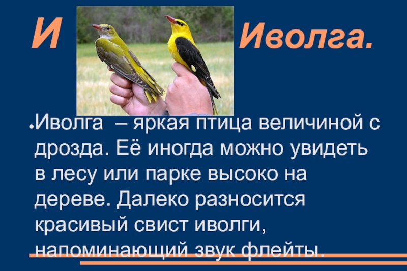 яркая птица величиной с дрозда. Её иногда можно увидеть в лесу или парке высоко на дереве. Далеко разносится красивый свист иволги, напоминающий звук флейты.