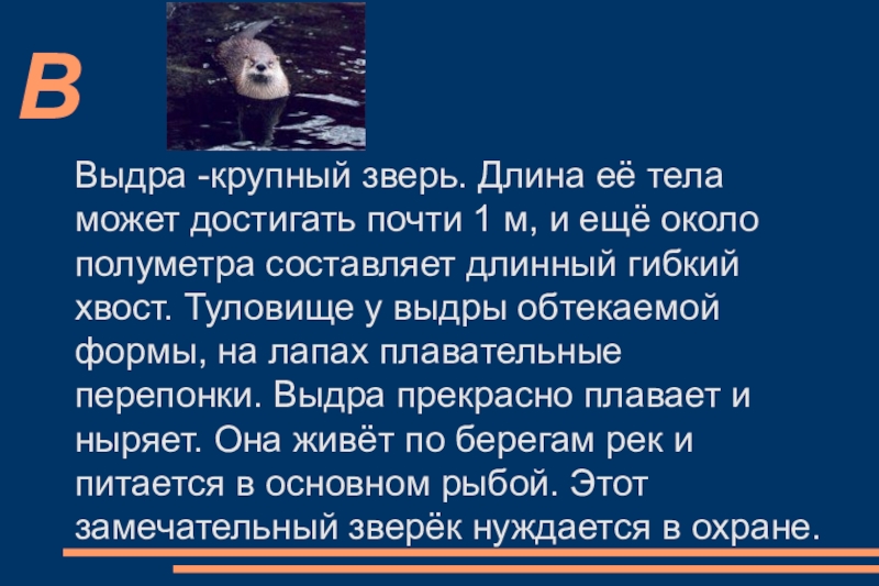 и ещё около полуметра составляет длинный гибкий хвост. Туловище у выдры обтекаемой формы, на лапах плавательные перепонки. Выдра прекрасно плавает и ныряет. Она живёт по берегам рек и питается в основном рыбой. Этот замечательный зверёк нуждается в охране.