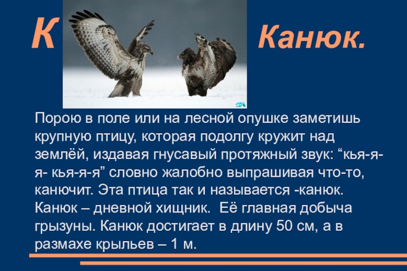 в поле или на лесной опушке заметишь крупную птицу, которая подолгу кружит над землёй, издавая гнусавый протяжный звук: “кья-я-я- кья-я-я” словно жалобно выпрашивая что-то, канючит. Эта птица так и называется -канюк. Канюк – дневной хищник. Её главная добыча грызуны. Канюк достигает в длину 50 см, а в размахе крыльев – 1 м.