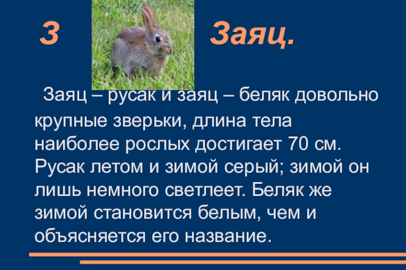Заяц – русак и заяц – беляк довольно крупные зверьки, длина тела наиболее рослых достигает 70 см. Русак летом и зимой серый; зимой он лишь немного светлеет. Беляк же зимой становится белым, чем и объясняется его название.