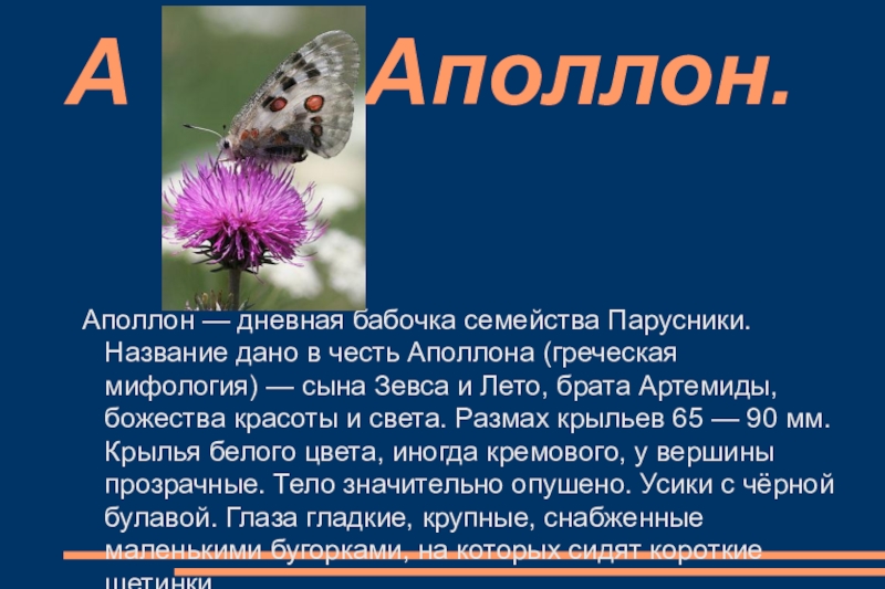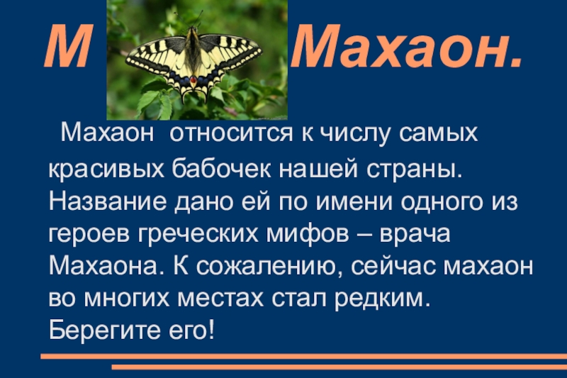 самых красивых бабочек нашей страны. Название дано ей по имени одного из героев греческих мифов – врача Махаона. К сожалению, сейчас махаон во многих местах стал редким. Берегите его!