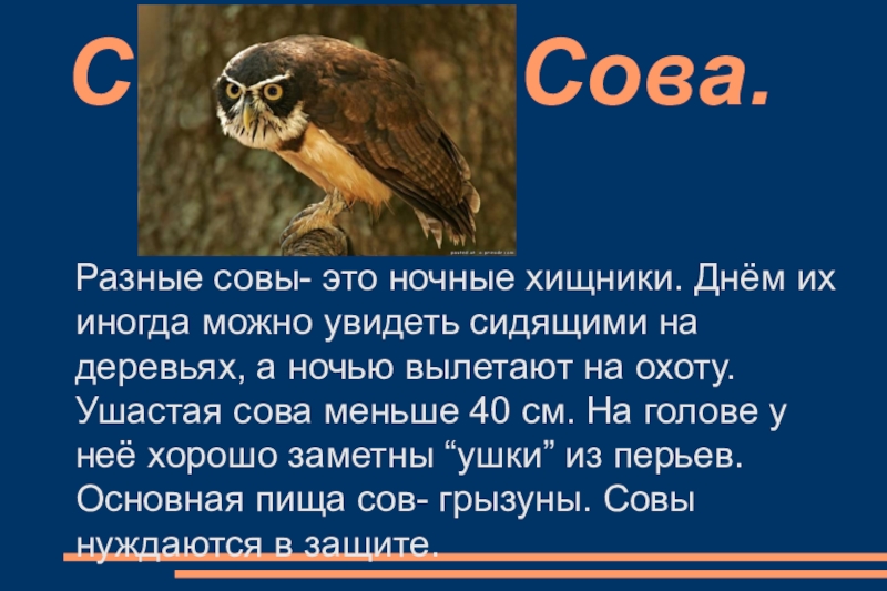 это ночные хищники. Днём их иногда можно увидеть сидящими на деревьях, а ночью вылетают на охоту. Ушастая сова меньше 40 см. На голове у неё хорошо заметны “ушки” из перьев. Основная пища сов- грызуны. Совы нуждаются в защите.