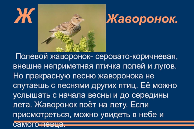 внешне неприметная птичка полей и лугов. Но прекрасную песню жаворонока не спутаешь с песнями других птиц. Её можно услышать с начала весны и до середины лета. Жаворонок поёт на лету. Если присмотреться, можно увидеть в небе и самого певца.