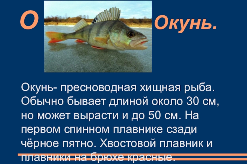 хищная рыба. Обычно бывает длиной около 30 см, но может вырасти и до 50 см. На первом спинном плавнике сзади чёрное пятно. Хвостовой плавник и плавники на брюхе красные.