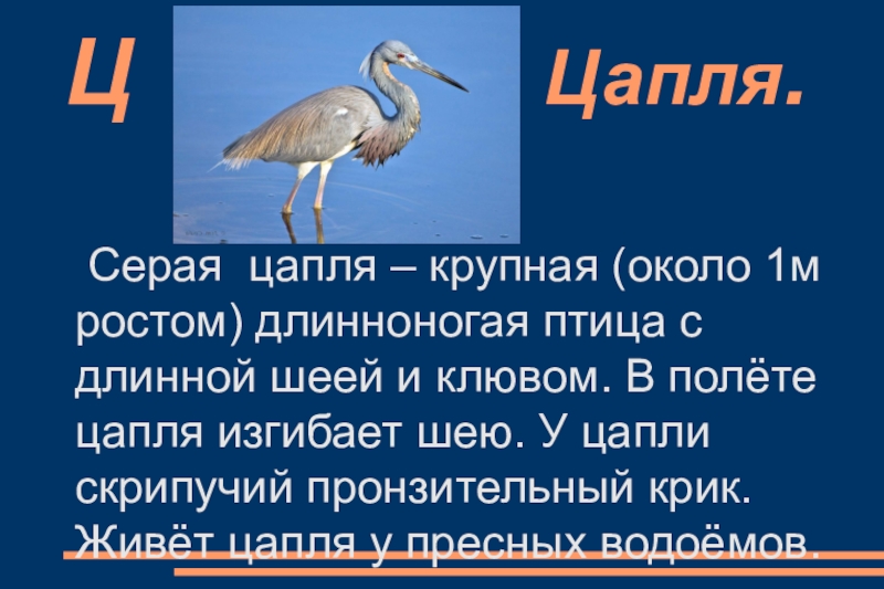 – крупная (около 1м ростом) длинноногая птица с длинной шеей и клювом. В полёте цапля изгибает шею. У цапли скрипучий пронзительный крик. Живёт цапля у пресных водоёмов.