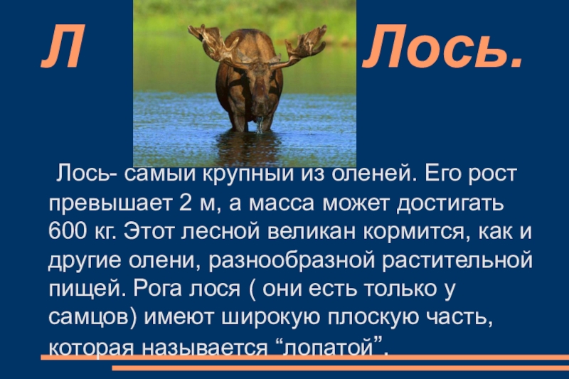 самый крупный из оленей. Его рост превышает 2 м, а масса может достигать 600 кг. Этот лесной великан кормится, как и другие олени, разнообразной растительной пищей. Рога лося ( они есть только у самцов) имеют широкую плоскую часть, которая называется “лопатой”.