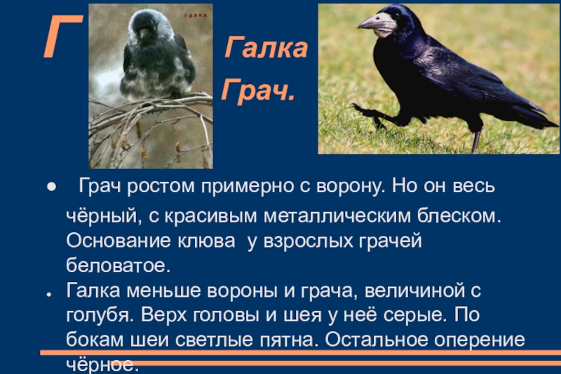 Грач ростом примерно с ворону. Но он весь чёрный, с красивым металлическим блеском. Основание клюва у взрослых грачей беловатое.
