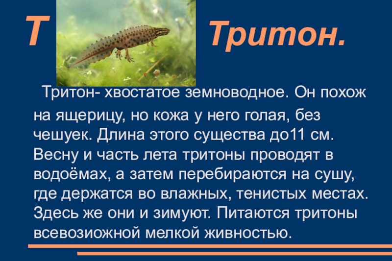 Он похож на ящерицу, но кожа у него голая, без чешуек. Длина этого существа до11 см. Весну и часть лета тритоны проводят в водоёмах, а затем перебираются на сушу, где держатся во влажных, тенистых местах. Здесь же они и зимуют. Питаются тритоны всевозиожной мелкой живностью.