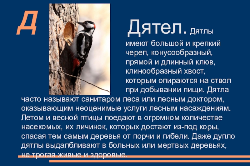 при добывании пищи. Дятла часто называют санитаром леса или лесным доктором, оказывающим неоценимые услуги лесным насаждениям. Летом и весной птицы поедают в огромном количестве насекомых, их личинок, которых достают из-под коры, спасая тем самым деревья от порчи и гибели. Даже дупло дятлы выдалбливают в больных или мертвых деревьях, не трогая живые и здоровые.