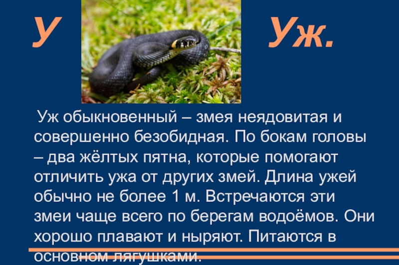 обыкновенный – змея неядовитая и совершенно безобидная. По бокам головы – два жёлтых пятна, которые помогают отличить ужа от других змей. Длина ужей обычно не более 1 м. Встречаются эти змеи чаще всего по берегам водоёмов. Они хорошо плавают и ныряют. Питаются в основном лягушками.