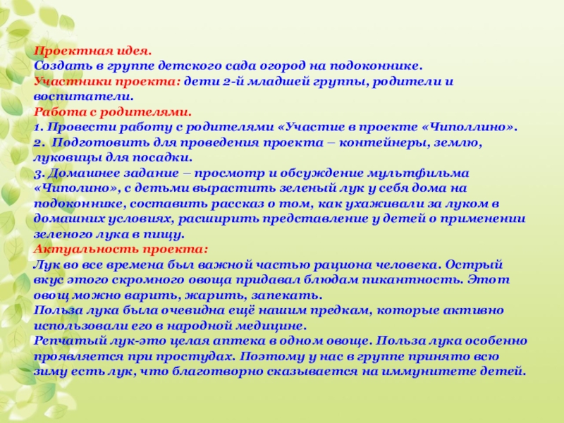 1. Провести работу с родителями «Участие в проекте «Чиполлино».