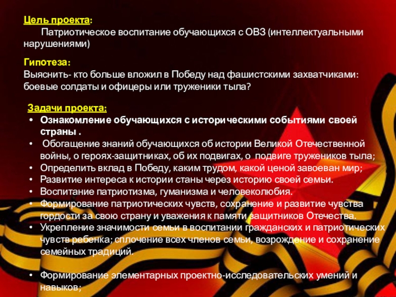 Формирование патриотических чувств, сохранение и развитие чувства гордости за свою страну и уважения к памяти защитников Отечества.