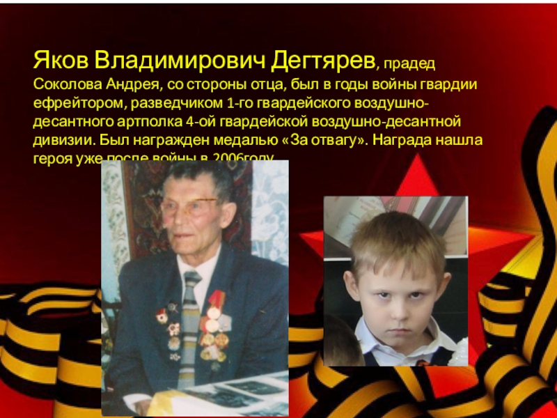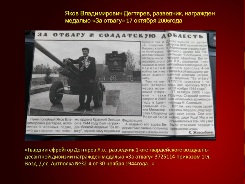 Яков Владимирович Дегтярев, разведчик, награжден медалью «За отвагу» 17 октября 2006года