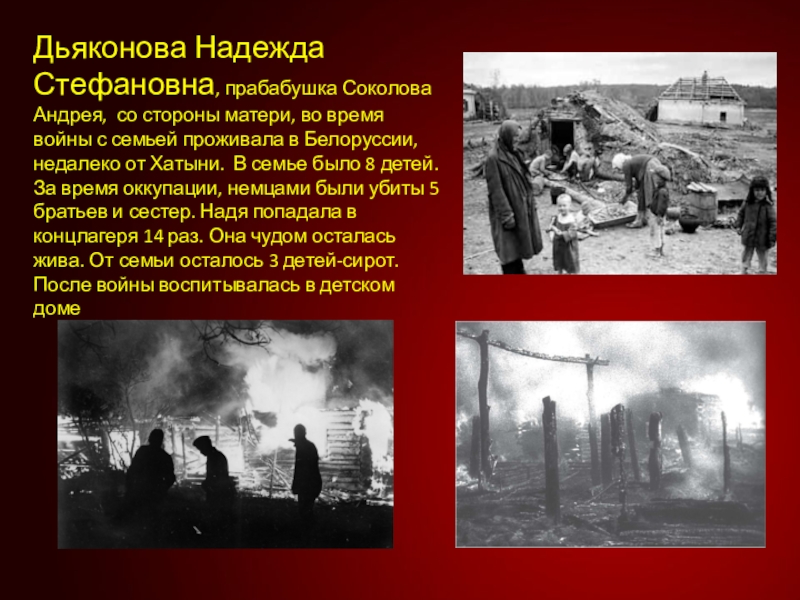 Дьяконова Надежда Стефановна, прабабушка Соколова Андрея, со стороны матери, во время войны с семьей проживала в Белоруссии, недалеко от Хатыни. В семье было 8 детей. За время оккупации, немцами были убиты 5 братьев и сестер. Надя попадала в концлагеря 14 раз. Она чудом осталась жива. От семьи осталось 3 детей-сирот. После войны воспитывалась в детском доме