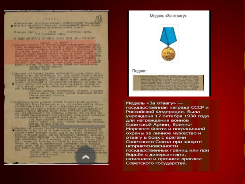 Медаль " За отвагу"-государственная награда СССР и российской Федерации. Была учреждена 17 октября 1938года для награждения войнов Советской Армии, Военно-морского Флота и пограничной охраны за личное мужество и отвагу в боях с врагами Советского Союза при защите неприкосновенности государственных границ или при борьбе с диверсантами, шпионами и прочими врагами Советского государства.
