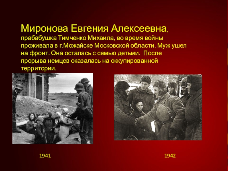 Миронова Евгения Алексеевна, прабабушка Тимченко Михаила, во время войны проживала в г.Можайске Московской области. Муж ушел на фронт. Она осталась с семью детьми. После прорыва немцев оказалась на оккупированной территории.