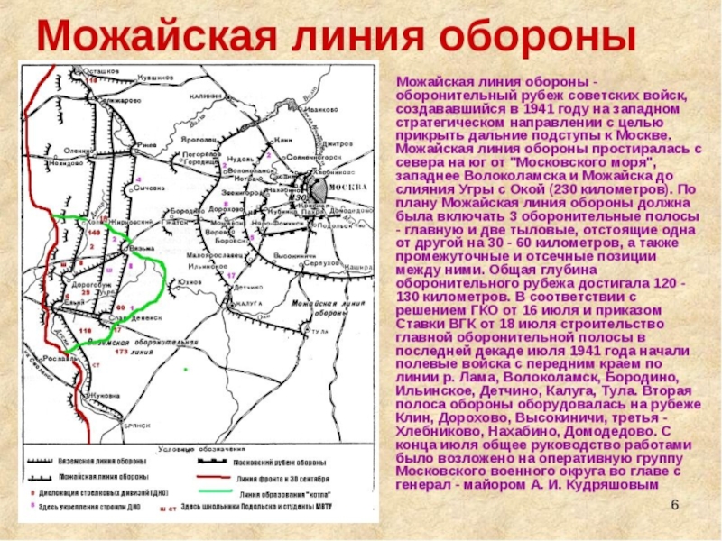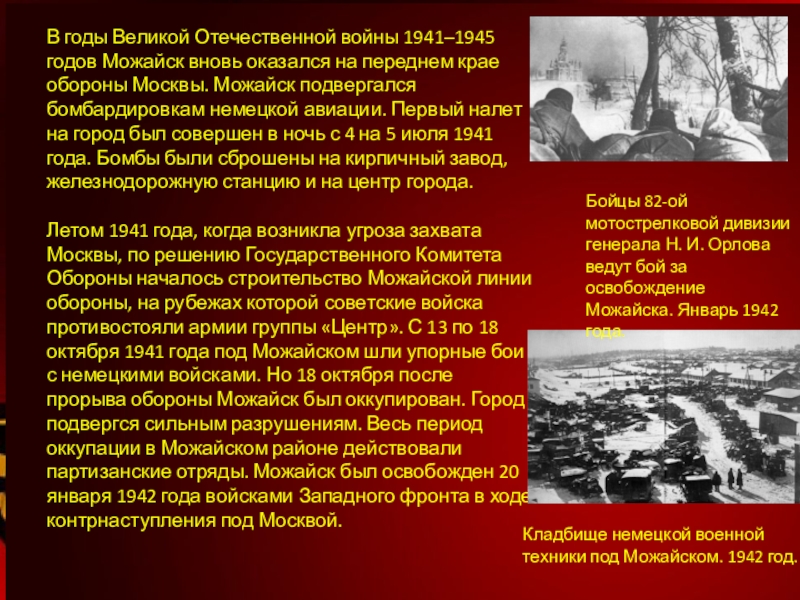 Летом 1941 года, когда возникла угроза захвата Москвы, по решению Государственного Комитета Обороны началось строительство Можайской линии обороны, на рубежах которой советские войска противостояли армии группы «Центр». С 13 по 18 октября 1941 года под Можайском шли упорные бои с немецкими войсками. Но 18 октября после прорыва обороны Можайск был оккупирован. Город подвергся сильным разрушениям. Весь период оккупации в Можайском районе действовали партизанские отряды. Можайск был освобожден 20 января 1942 года войсками Западного фронта в ходе контрнаступления под Москвой.