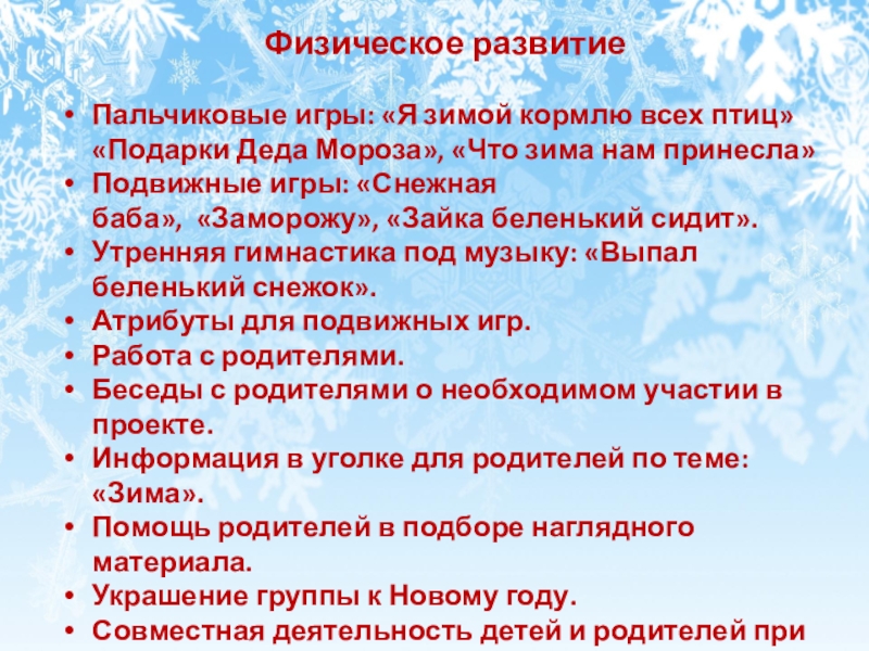 Речевые игры: «Погреться на морозе», «Снежинки летят», «Вьюга», «Дует ветер», «Снегири».