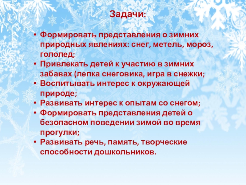 Формировать представления о зимних природных явлениях: снег, метель, мороз, гололед;