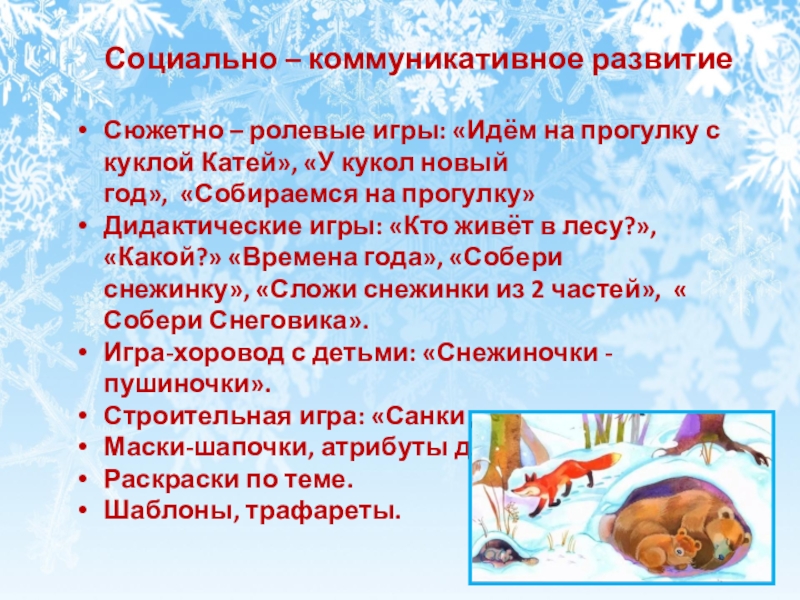Дидактические игры: «Кто живёт в лесу?», «Какой?» «Времена года», «Собери снежинку», «Сложи снежинки из 2 частей», « Собери Снеговика».
