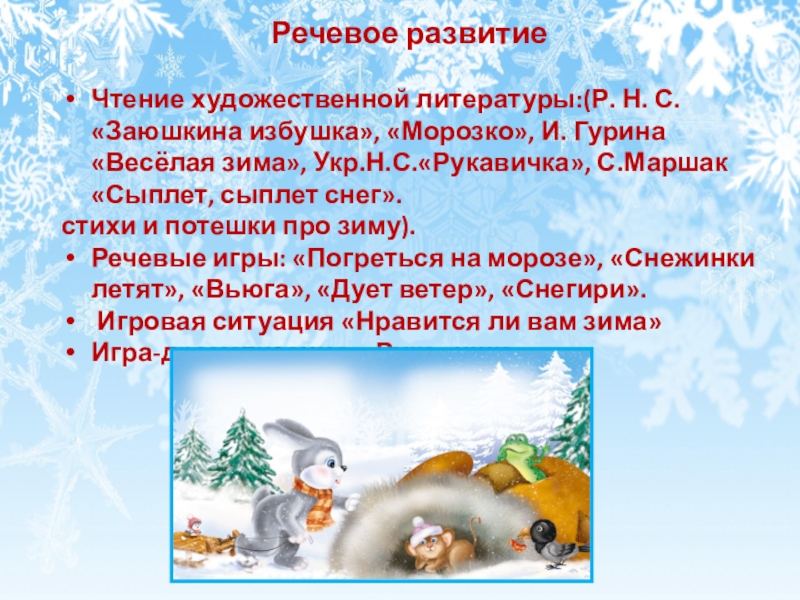 «Весёлая зима», Укр.Н.С.«Рукавичка», С.Маршак «Сыплет, сыплет снег».