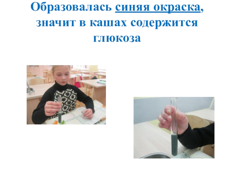 Слайд 21Образовалась синяя окраска, значит в кашах содержится глюкоза