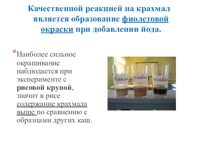 Слайд 18Качественной реакцией на крахмал является образование фиолетовой окраски при добавлении йода.