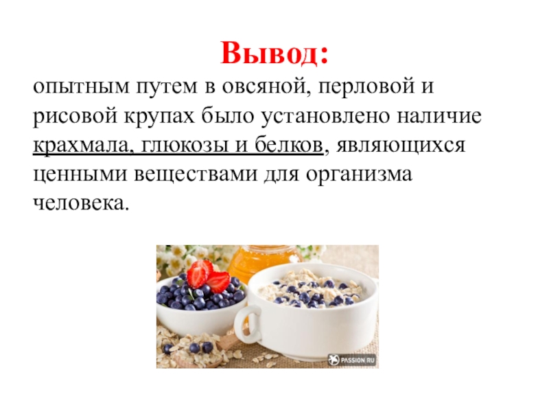 1. Выявить в кашах содержание необходимых для организма веществ (крахмала, глюкозы и белков).