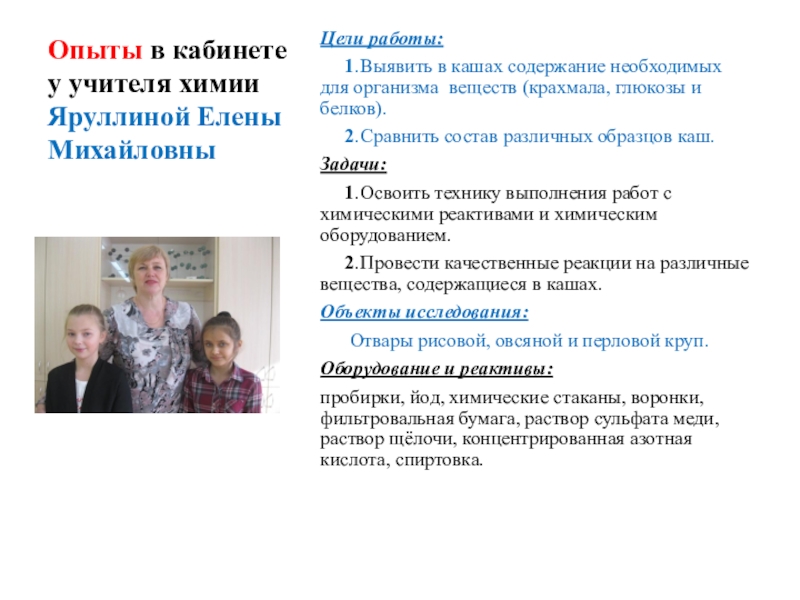 Опыты в кабинете у учителя химии Яруллиной Елены Михайловны