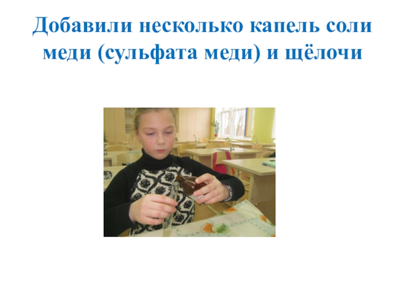 Слайд 20Добавили несколько капель соли меди (сульфата меди) и щёлочи