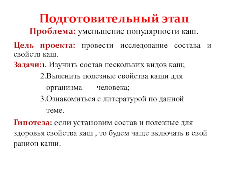 Гипотеза: если установим состав и полезные для здоровья свойства каш , то будем чаще включать в свой рацион каши.