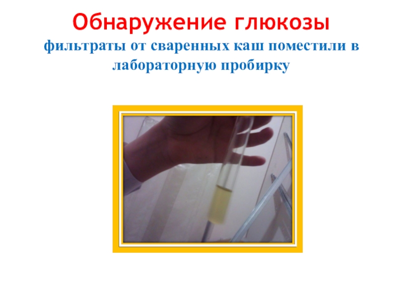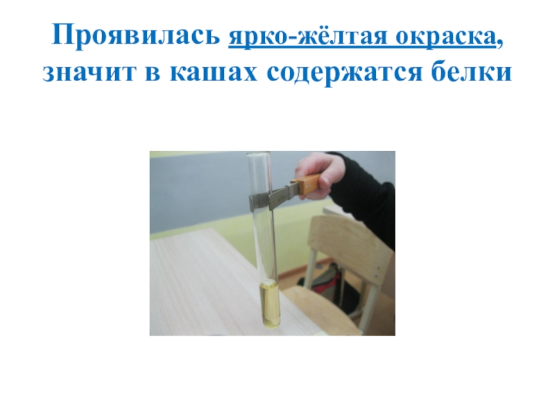 Слайд 24Проявилась ярко-жёлтая окраска, значит в кашах содержатся белки