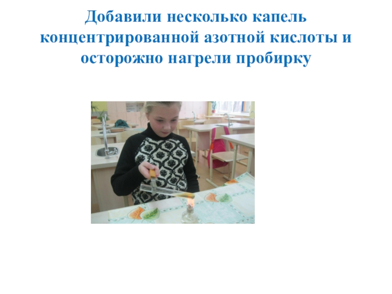 Слайд 23Добавили несколько капель концентрированной азотной кислоты и осторожно нагрели пробирку