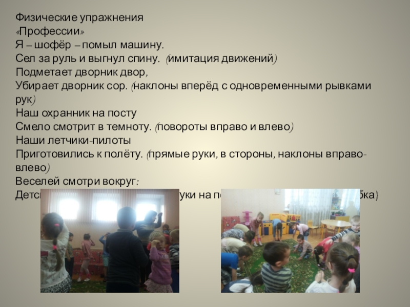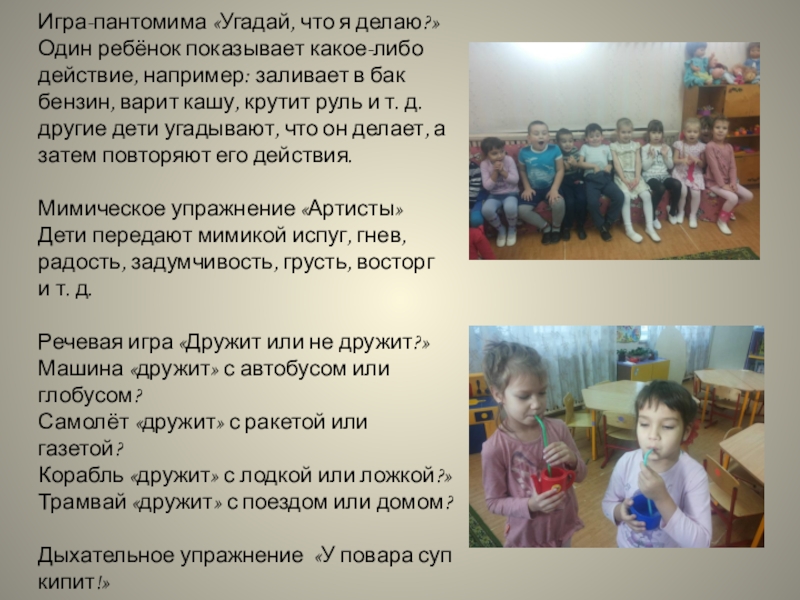 в бак бензин, варит кашу, крутит руль и т. д. другие дети угадывают, что он делает, а затем повторяют его действия.