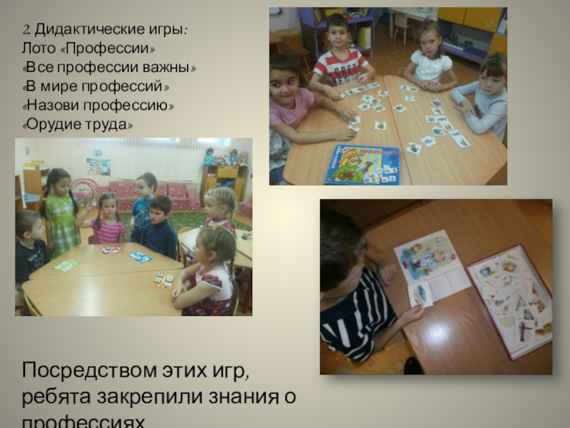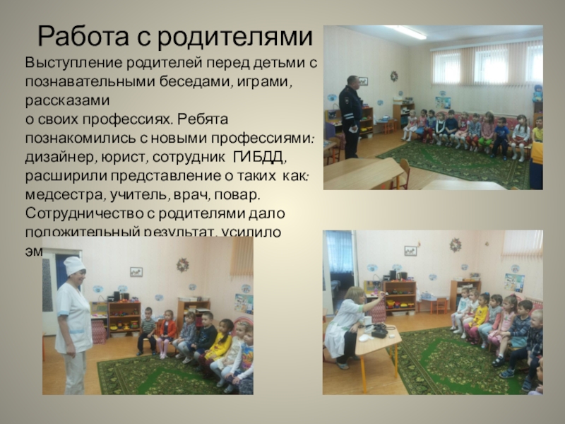 о своих профессиях. Ребята познакомились с новыми профессиями: дизайнер, юрист, сотрудник ГИБДД, расширили представление о таких как: медсестра, учитель, врач, повар. Сотрудничество с родителями дало положительный результат, усилило эмоции детей.