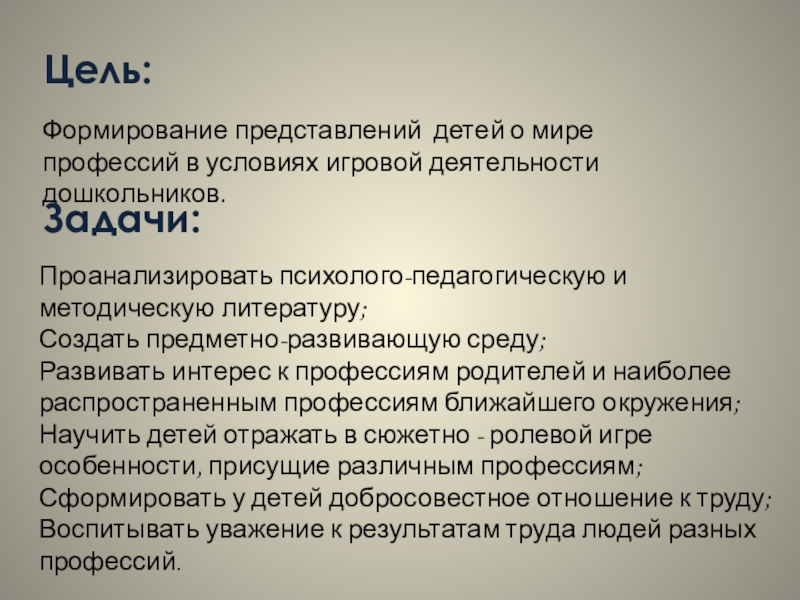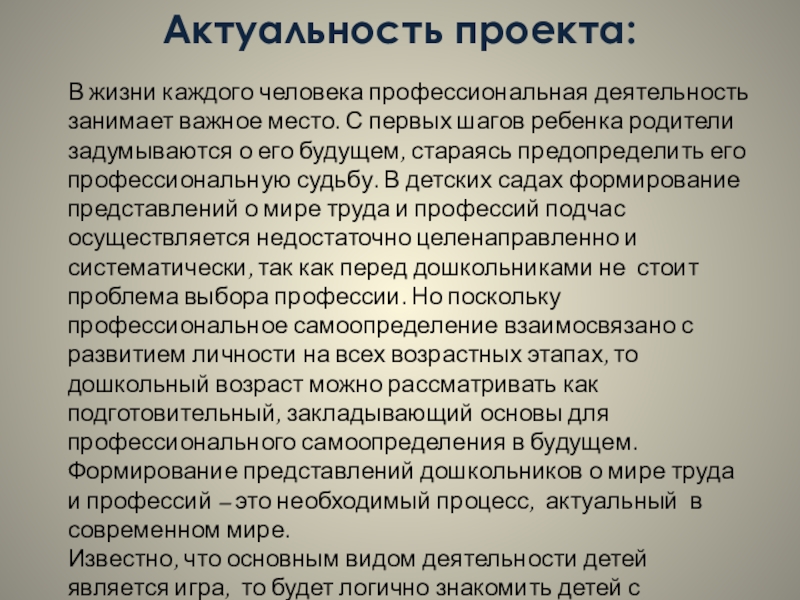 первых шагов ребенка родители задумываются о его будущем, стараясь предопределить его профессиональную судьбу. В детских садах формирование представлений о мире труда и профессий подчас осуществляется недостаточно целенаправленно и систематически, так как перед дошкольниками не стоит проблема выбора профессии. Но поскольку профессиональное самоопределение взаимосвязано с развитием личности на всех возрастных этапах, то дошкольный возраст можно рассматривать как подготовительный, закладывающий основы для профессионального самоопределения в будущем. Формирование представлений дошкольников о мире труда и профессий – это необходимый процесс, актуальный в современном мире.