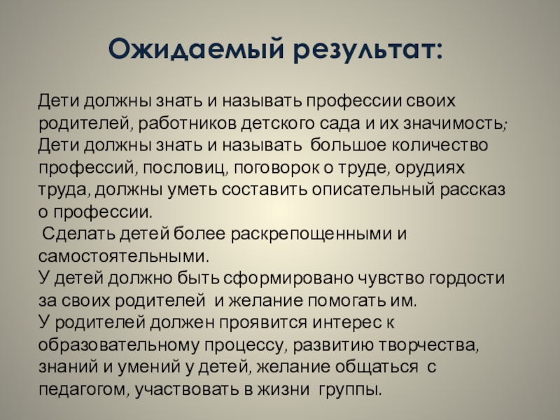 Дети должны знать и называть большое количество профессий, пословиц, поговорок о труде, орудиях труда, должны уметь составить описательный рассказ о профессии.