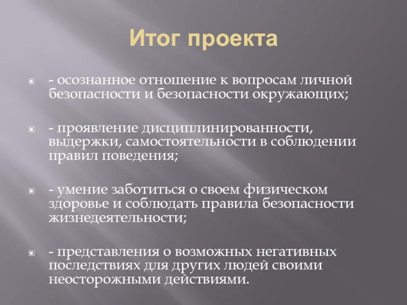 Итог проекта- осознанное отношение к вопросам личной безопасности и безопасности окружающих;- проявление дисциплинированности, выдержки, самостоятельности в соблюдении