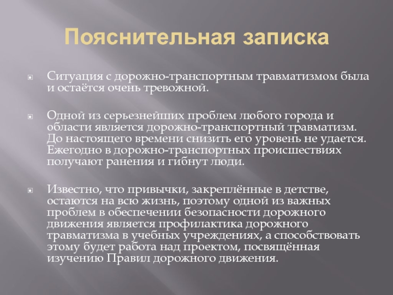 Пояснительная запискаСитуация с дорожно-транспортным травматизмом была и остаётся очень тревожной.Одной из серьезнейших проблем любого города и области